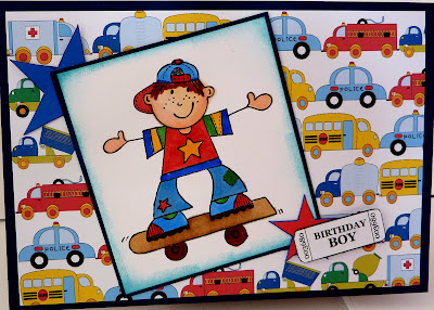 I decided to make a background paper with mine, and then put a stamped image of a boy skateboarding on top, which has been coloured with Copics. I think this stamp must be one of the first I ever bought (which is moons ago), because I cannot even see the brand on it any longer! The edges of the stamped image have been wiped around with distress ink. The navy blue card is Core'dinations. The stars are computer-drawn and cut out, and the sentiment is from a sheet of images which was a RAK from a friend.